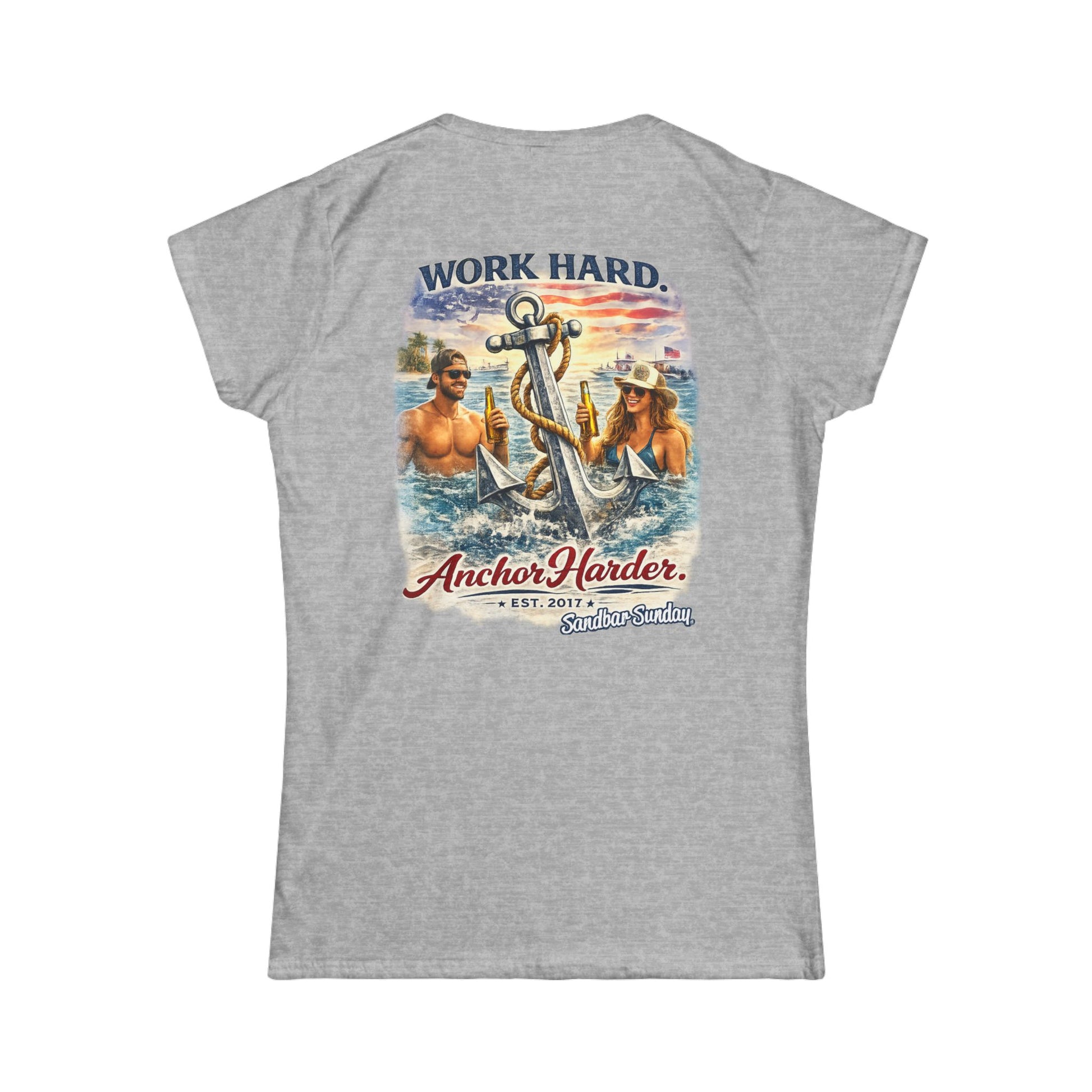 The front keeps it subtle with a clean Sandbar Sunday script across the chest. The back makes the statement. A vibrant coastal scene featuring bold anchor art, sunlit water, and confident sandbar energy brings the lifestyle to life.