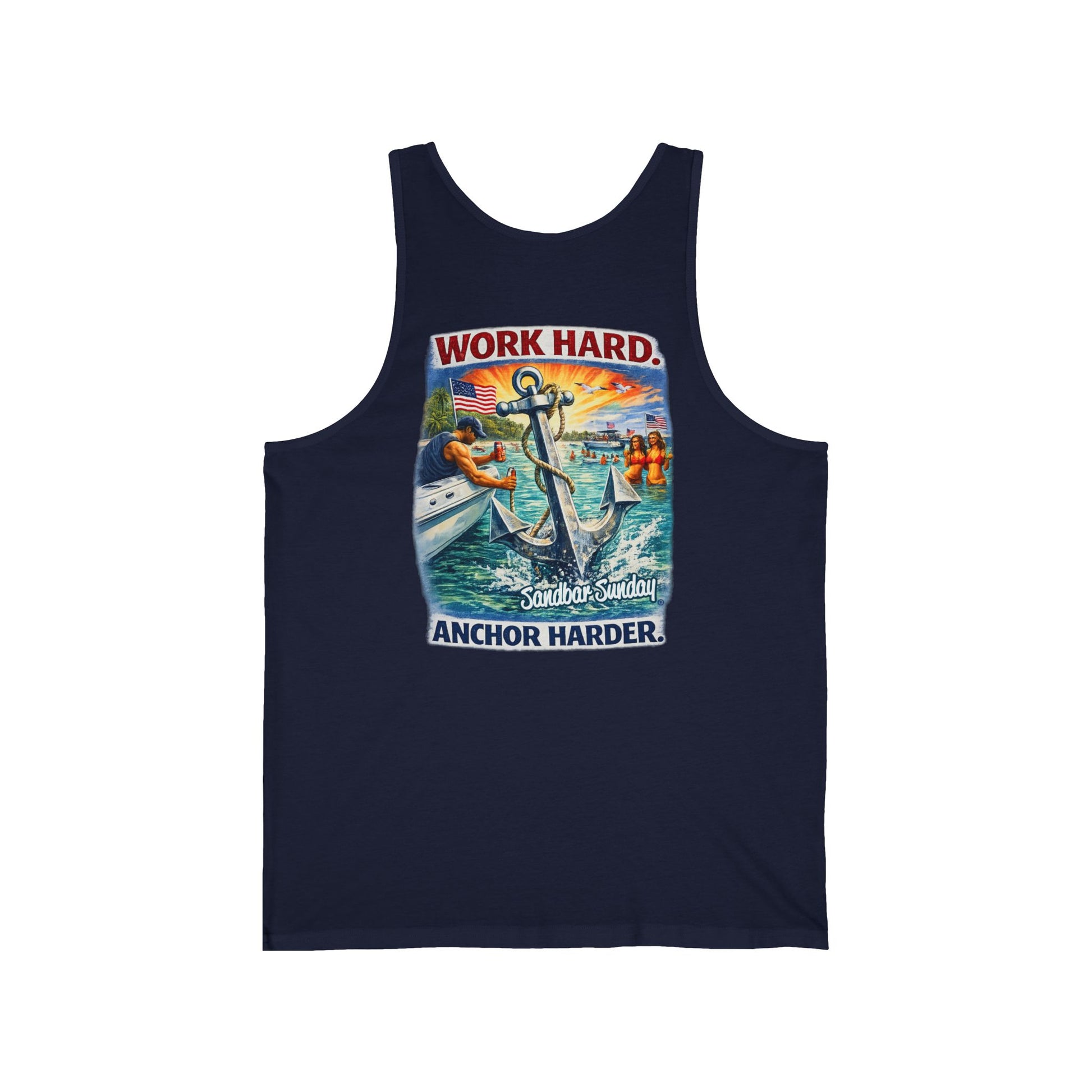 Featuring our bold Sandbar Sunday artwork, this design captures the moment the anchor drops and the real day begins. Sunlit water. American flags. Boats tied up. The reward after a long week.